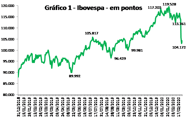 Nesse contexto de pânico, o Ibovespa recuou 8,4% em fevereiro e acumula queda de 9,9% em 2020, fechando aos 104.172 pontos, ante os 113.761 pontos de janeiro/20 (como no gráfico abaixo).