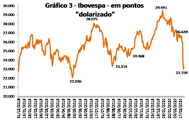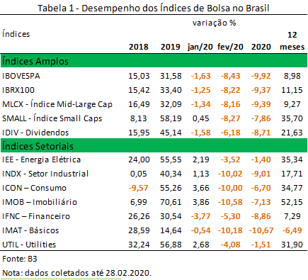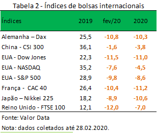 Externamente, em fevereiro, viu-se forte aversão ao risco no mercado internacional por conta do coronavírus, fazendo com que as principais bolsas mundiais tivessem recuo similar ao mercado brasileiro no mês passado. Como exemplo, vejam que o índice Dow Jones, dos EUA, recuou 11,5% em fevereiro (ver tabela abaixo).