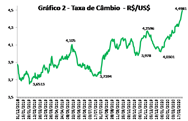 Nesse ambiente, o dólar bateu novo recorde de cotação nominal em relação ao real. A taxa de câmbio alcançou no fechamento do dia 28 de fevereiro R$/US$ 4,49. Isso em razão da valorização da moeda norte-americana em relação às outras moedas e por questões relacionadas ao cenário interno político e econômico (como no gráfico abaixo).