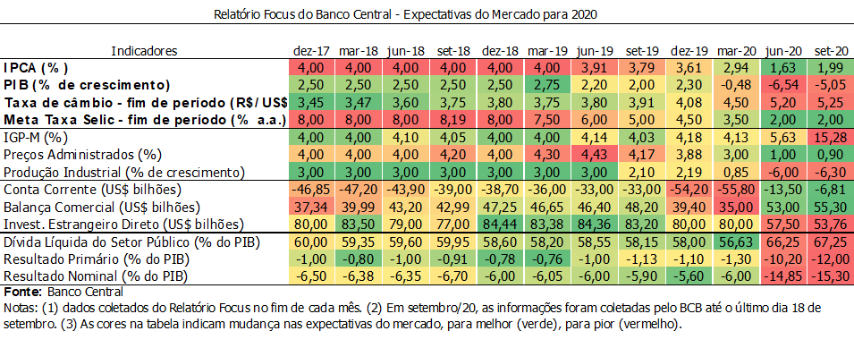 - Quanto ao crescimento, o PIB brasileiro esperado para 2020 que chegou a ser projetado a uma taxa de crescimento próxima a -10% por algumas instituições, atualmente, pela media do Focus, está com estimativa de -5,05%, na medida em que a economia foi reabrindo e pelo impacto do auxílio emergencial do governo, que fez retomar o consumo.