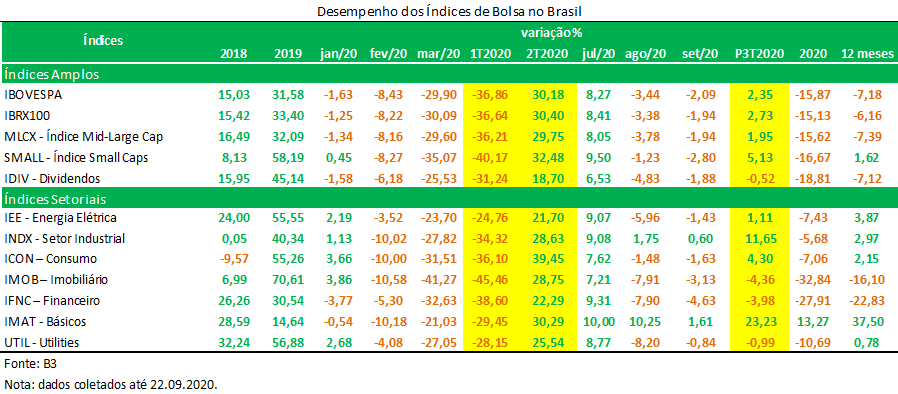 Assim, podemos observar na tabela abaixo, que após a forte recuperação do Ibovespa até julho/20, estamos observando uma realização de lucros nos meses de agosto e setembro, com a justificativa de temor em relação a segunda onda de Covid-19, de receio em relação ao estouro de uma bolha, de dúvidas em relação à eleição nos Estados Unidos e de risco fiscal no Brasil.